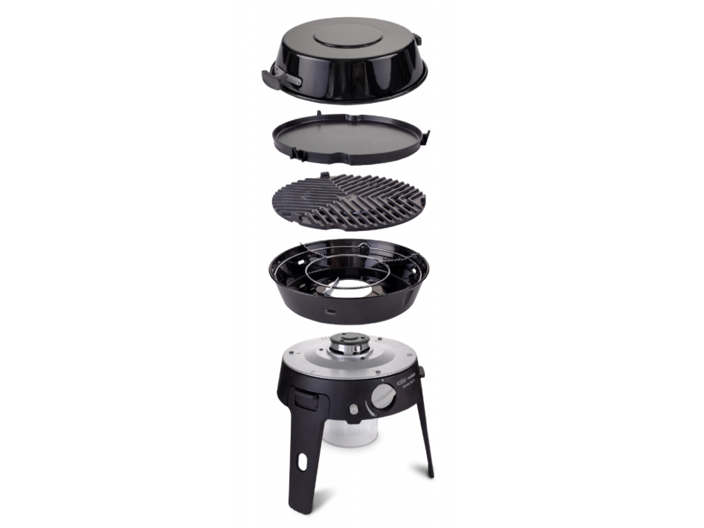 Wyjmowana tacka na tłuszcz zbiera pozostałości z gotowania i jednocześnie chroni palnik przed wiatrem, co zapobiega zgaśnięciu płomienia. Tackę można łatwo umyć przy użyciu wody i płynu do naczyń, dzięki czemu utrzymanie grilla w czystości jest bardzo proste. Składane nóżki ułatwiają transport i przechowywanie, a dołączona torba pozwala wygodnie zabrać grill w podróż. W nóżkach znajdują się specjalne otwory umożliwiające pozostawienie szybkozłączki podłączonej do urządzenia podczas przechowywania.