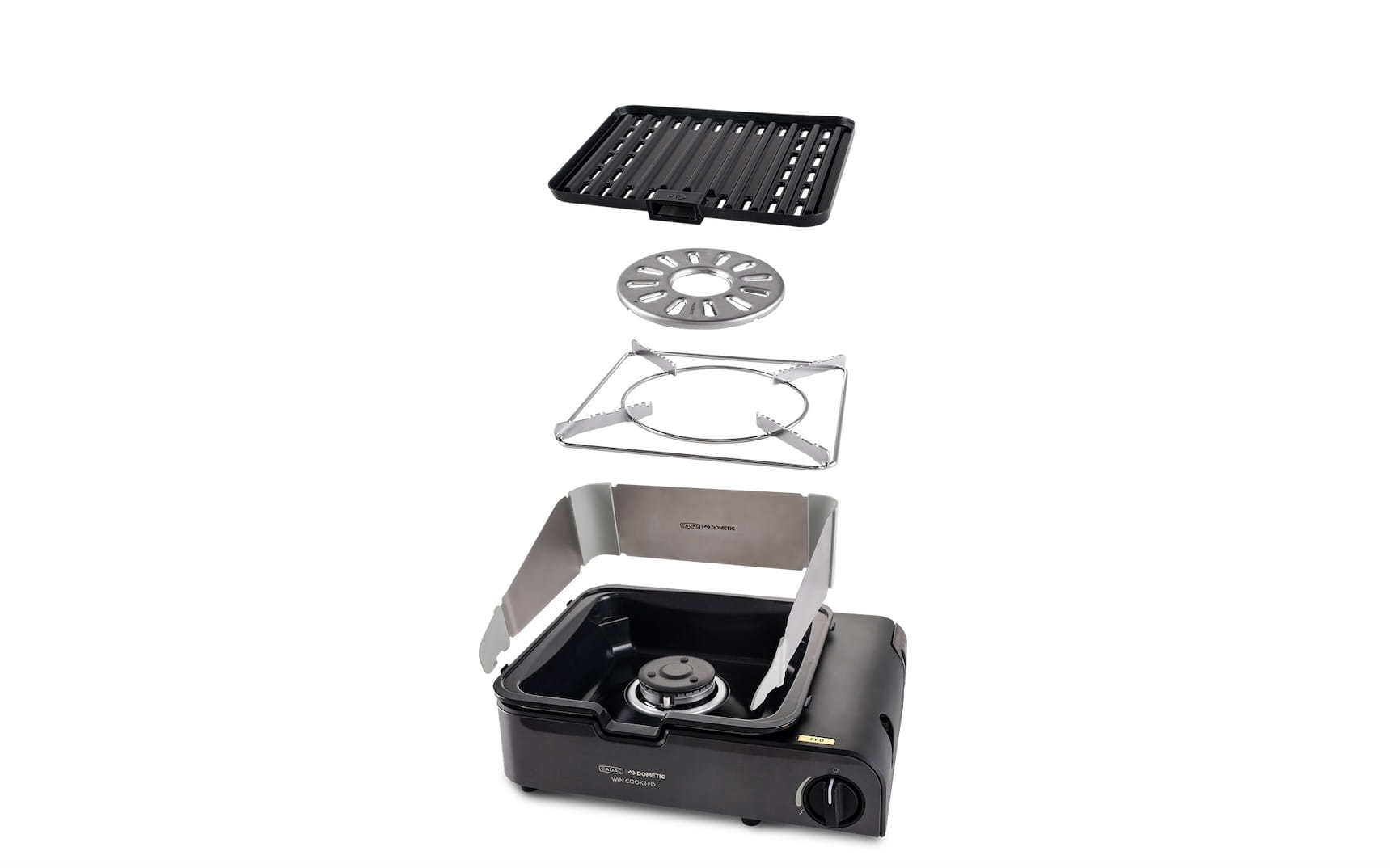 Van Cook FFD wyposażony jest w płytę do grillowania, podstawkę pod dzbanek do kawy i uchwyt na patelnię. Płytę grillową można szybko założyć lub zdjąć dzięki zdejmowanemu uchwytowi. Ceramiczna powłoka GreenGrill zapewnia zdrowsze gotowanie i łatwe czyszczenie. Zestaw zawiera również praktyczną osłonę chroniącą przed wiatrem i rozchlapywaniem.