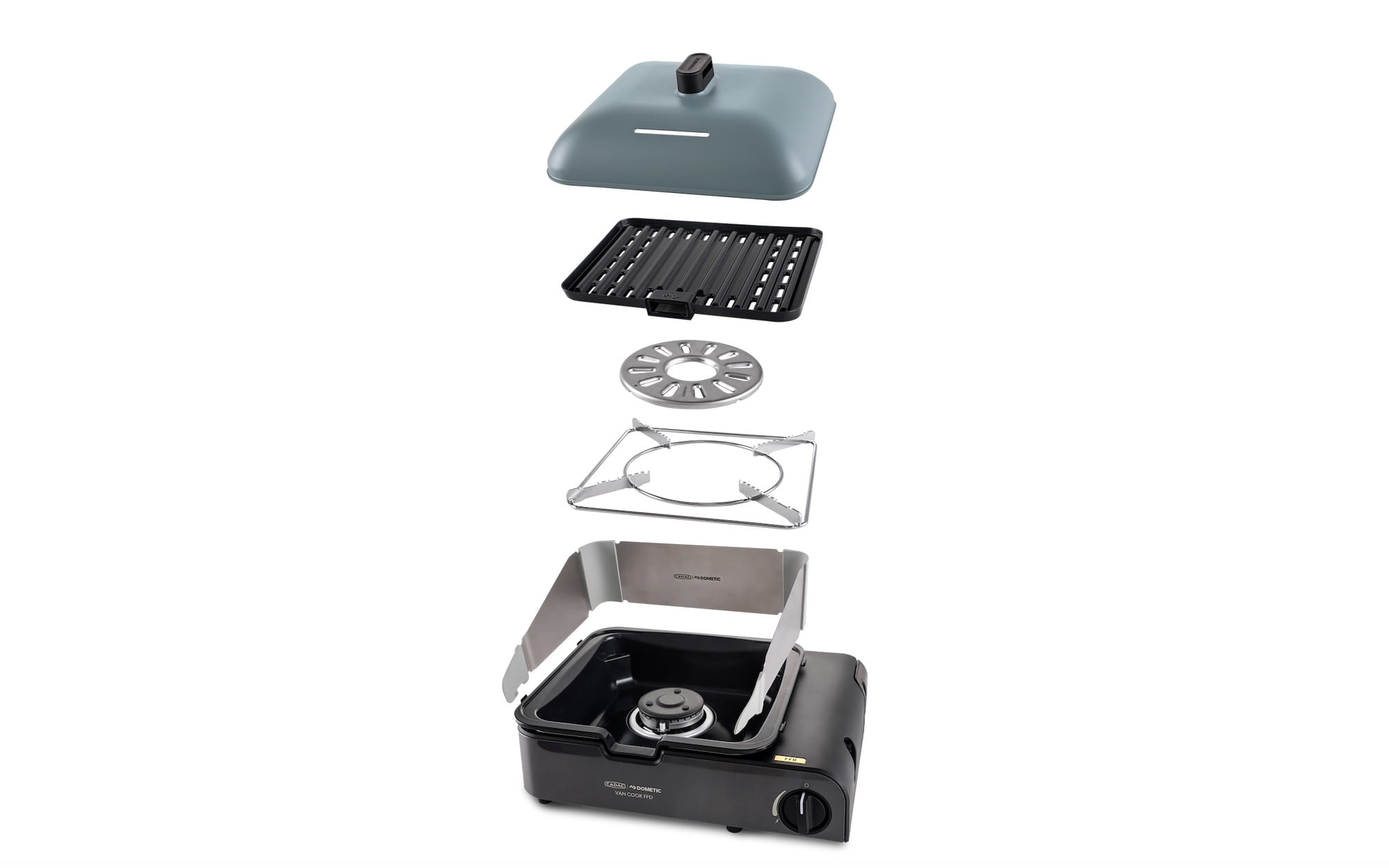 Van Cook FFD Combo wyposażony jest w płytę do grillowania, podstawkę pod dzbanek do kawy, uchwyt na patelnię i pokrywkę. Płytę grillową można szybko założyć lub zdjąć dzięki zdejmowanemu uchwytowi. Ceramiczna powłoka GreenGrill zapewnia zdrowsze gotowanie i łatwe czyszczenie. Zestaw zawiera również praktyczną osłonę chroniącą przed wiatrem i rozchlapywaniem.