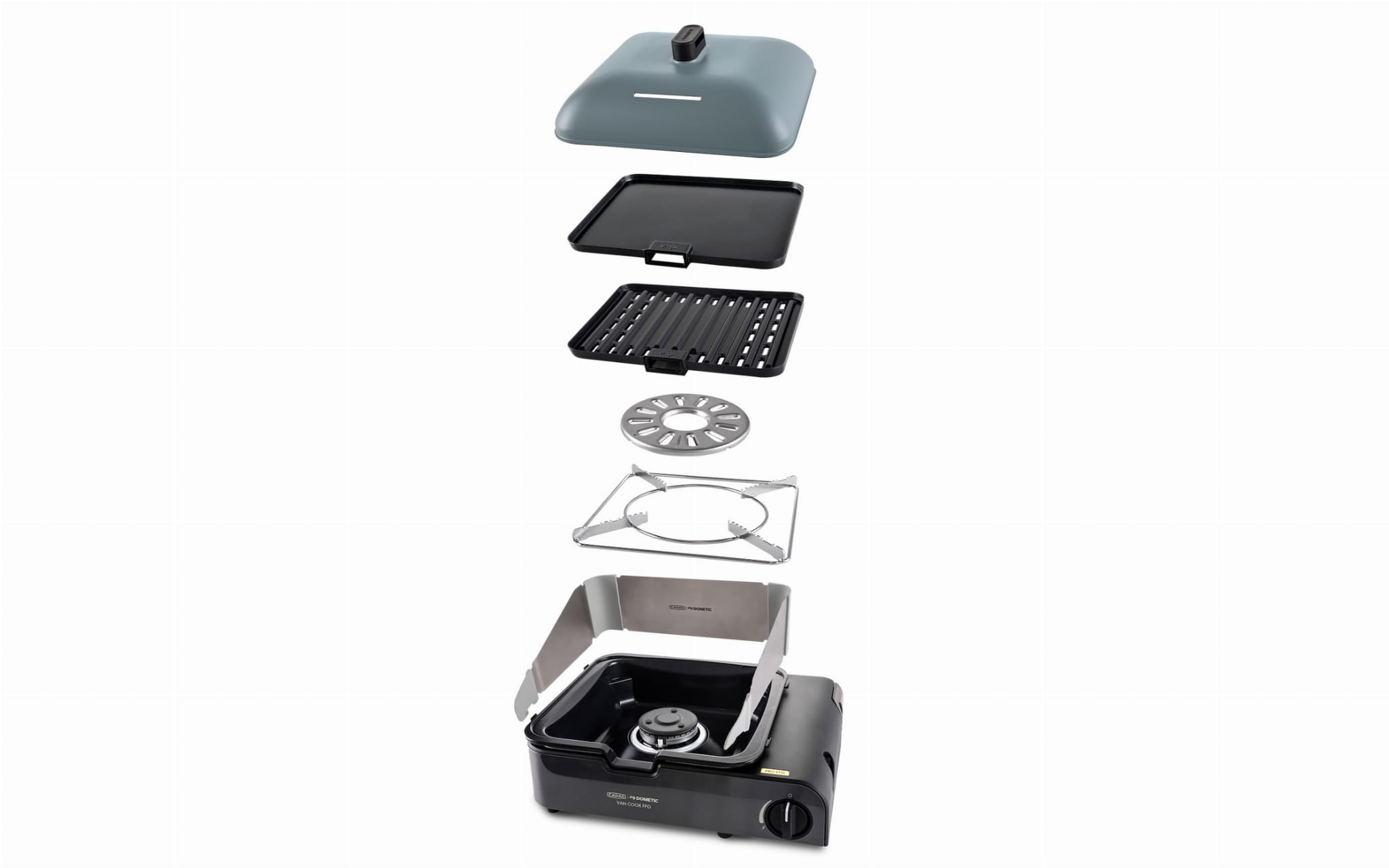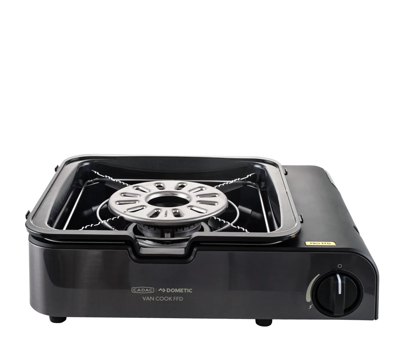 Van Cook PRO FFD Deluxe to najbardziej rozbudowana wersja urządzenia. Zestaw obejmuje blachę do pieczenia, płytę grillową, podstawkę pod ekspres do kawy, uchwyt na patelnię oraz pokrywkę. Elementy grillowe można łatwo montować i demontować dzięki zdejmowanemu uchwytowi. Ceramiczna powłoka GreenGrill umożliwia zdrowsze gotowanie i ułatwia czyszczenie. W zestawie znajduje się także osłona przeciwwiatrowa i przeciw zachlapaniu oraz luksusowe, wysokiej jakości etui transportowe.