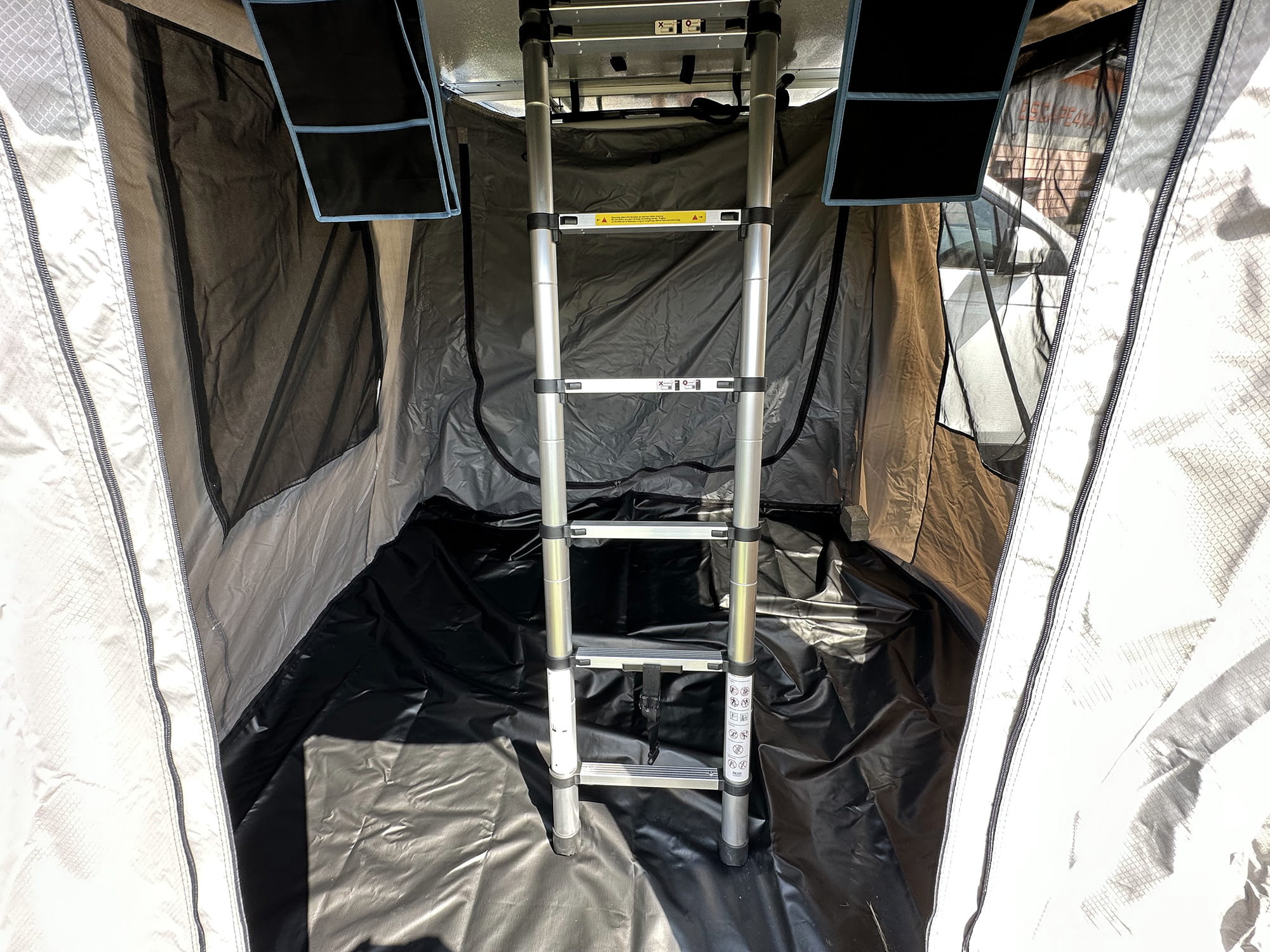 Przedsionek do namiotu dachowego w wersji long. Wykonany z poliestru 420D, posiada 2 otwory okienne z moskitierami oraz okiennicami, drzwi wejściowe oraz otwieraną ścianę od strony bagażnika. U dołu przedsionka gumowana, odpinana podłoga. W zestawie szpilki do montażu do podłoża.