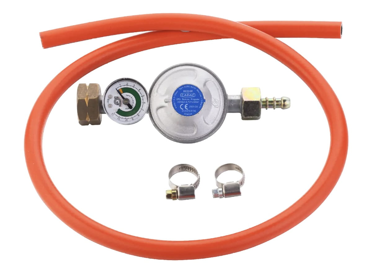Dodatkowo zabezpieczenie przepływu automatycznie odcina dopływ gazu w przypadku uszkodzenia lub nieszczelności przewodu, zwiększając bezpieczeństwo użytkowania. Zestaw zawiera regulator, manometr, wąż gazowy o długości 85 cm oraz zaciski do jego solidnego i szczelnego montażu.