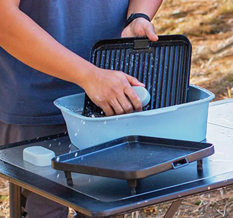 Soft Soak jest wykonany z bezpiecznego dla żywności, odpornego na wysokie temperatury silikonu. Ten materiał jest miękki i elastyczny, dzięki czemu Soft Soak można łatwo zabrać ze sobą i używać. Jeśli ruszt jest mocno zabrudzony, możesz go namoczyć na godzinę przed czyszczeniem. Jest odpowiedni do rusztów o maksymalnych wymiarach 40 cm.