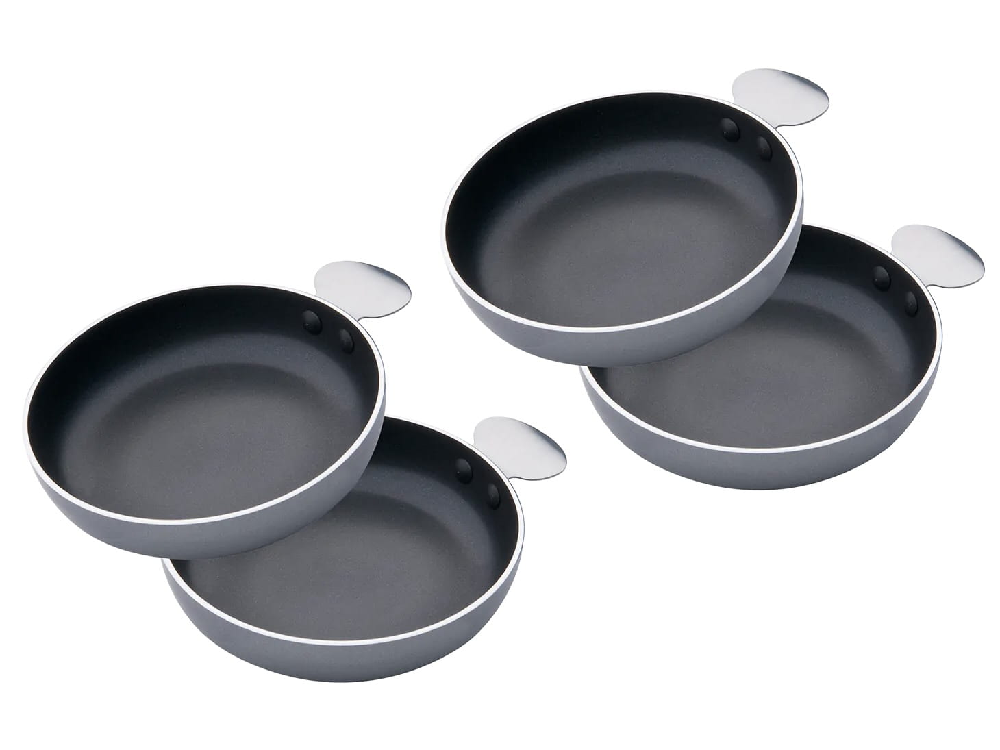 Zestaw 4 małych patelni (12,5 cm) wykonanych z aluminium z powłoką nieprzywierającą, idealnych do jednoczesnego przygotowywania jajek na różne sposoby. Świetnie sprawdzą się także do przyrządzania smacznych tapas. Lekkie, łatwe w czyszczeniu, przeznaczone do użytku na grillu oraz na kuchence domowej i kempingowej.